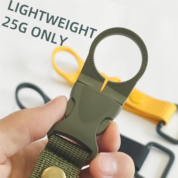 【プロの二種固定方法】**固定方法はプロの2WAYあります。 ▼カラビナクリップ:バッグ/ギアベルトへの瞬時アタッチ。 ▼強化型マジックテープ+ボタンロック:激しい動きでもゼロシェイク。サバゲー/岩登りなど過酷な環境下でもボトルを確実ホールドします。