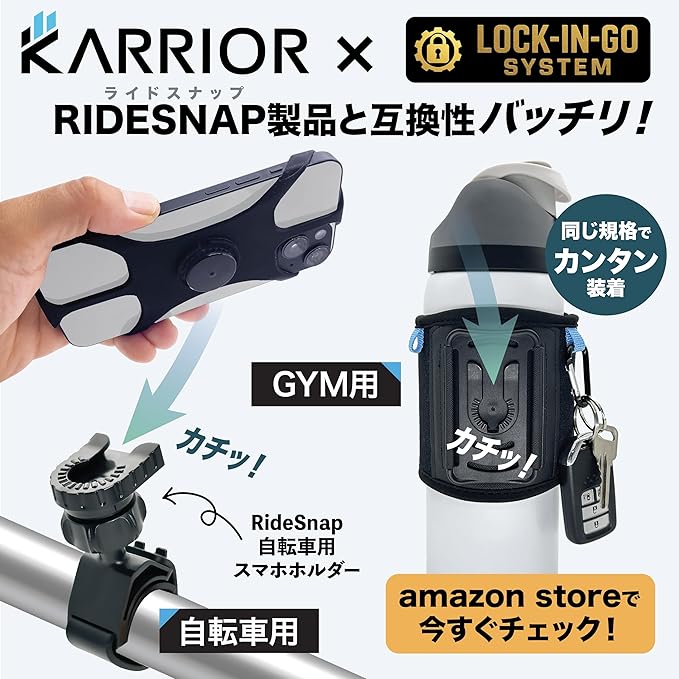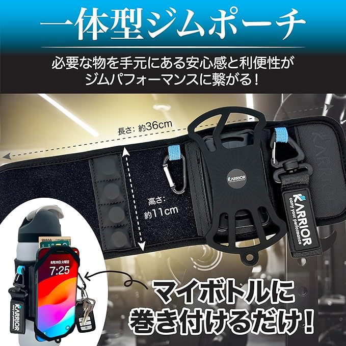 【概要】KARRIOR(キャリアー)ボトルポーチはお気に入りのボトルに巻くだけで、必需品を一つにまとめられるジムトレーニングに最適なアイテムです。 お持ちのボトルが360 回転する着脱式スマホホルダー、タオルホルダー、鍵ホルダー、そしてカードや現金を収納できる隠しポケットなどの多機能ポーチへと大変身します。さらに、4つの強力なマグネットを備えており、ジムマシンなどの金属製の表面に簡単に取り付けられます。これにより、大切な荷物を床に置く必要がなく、必需品を手の届く場所に安全に保管できます。※ボトル・水筒などは付属しません。