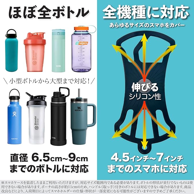 【対応ボトル・スマホ】◾️直径6.5cm~9cmのボトルに対応 ◾️スマホは 4.5インチ〜 7インチまで対応。※ボトルの側面の形状が並行でないものは使用できない場合があります。また、ポーチの高さが11cmのため、ハンドル(取っ手)付きのボトルには対応できない場合があります。ご購入の前にお手持ちのボトルのサイズをご確認ください。スマホケースを装着したままでもご利用いただけますが、上記対応サイズ範囲内である必要があります。マグネットの耐荷重はポーチ本体とスマホホルダーの重量を含めて1.5KGです。耐荷重を超える重量のものは、危険ですのでご使用にならないでください。