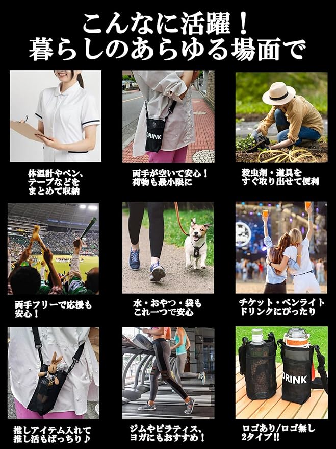 対応サイズ: 約500ml〜700mlのペットボトル・ステンレス水筒・炭酸ボトル対応。※一部太め形状は非対応。500mlペットボトルが入るサイズ感で、日常やアウトドアに。 20 9 9㎝