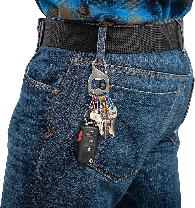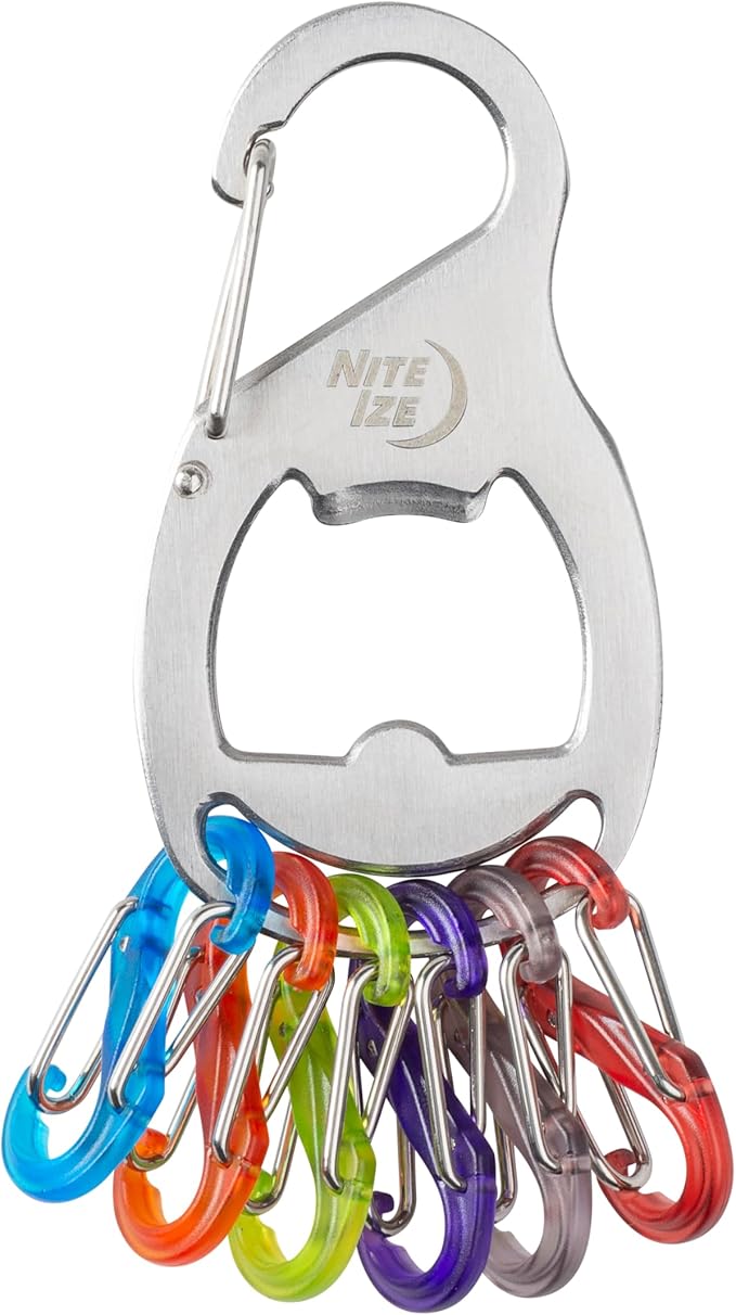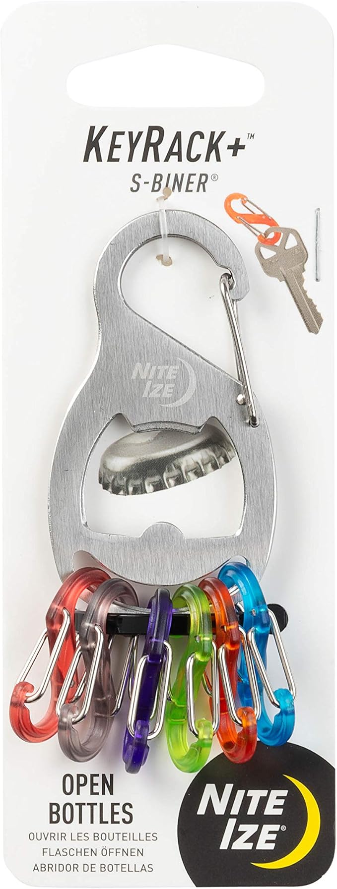 便利なボトルオープナー機能付のステンレスS-BINERキーラック。S-BINER PLASTICが6色付属し、それぞれにキーの取り付けが可能