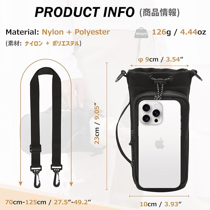 【寸法】水筒ポーチ本体:縦23cm、直径9cm;ショルダーストラップ+バックル:70~125cm(約);カラーは4色が用意されており、おしゃれでお好みに合わせて選ぶことができます