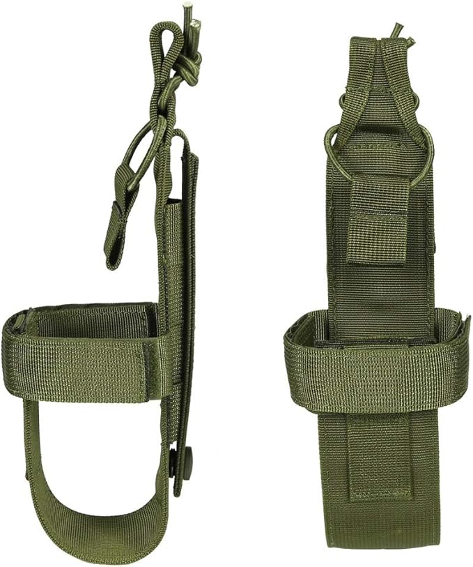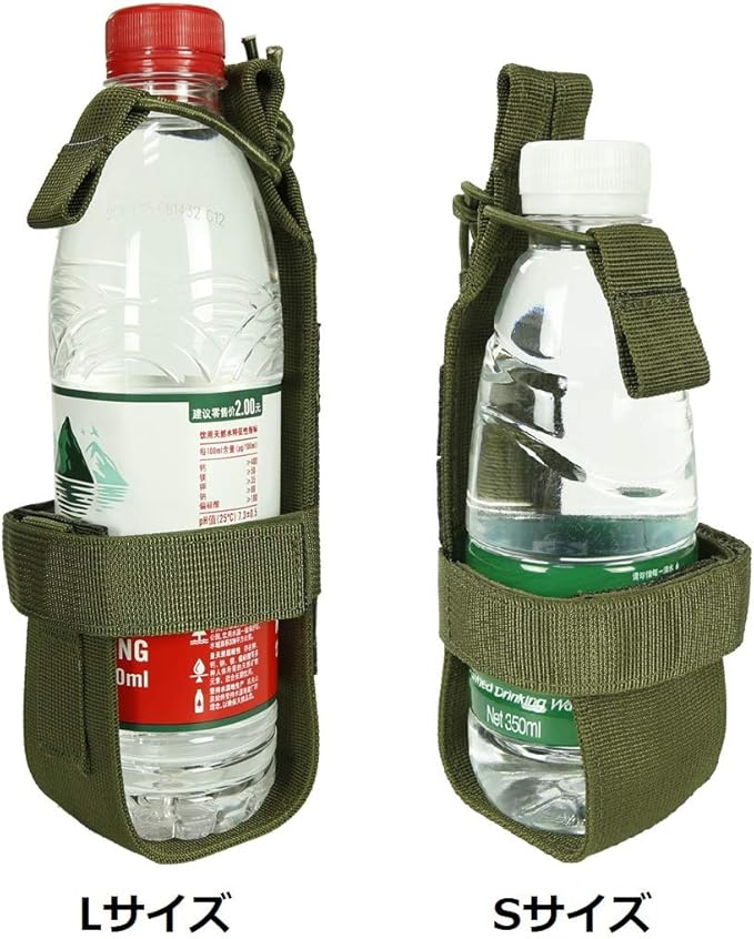 デザイン:背面にモールストラップ付きで、モール対応したバックパック、ベルト、ベストに取り付ける可能で、持ち運びには手軽です。マジックテープ式のベルトがサイズに合わせて調整可能です、いろんな直径のペットボトルや水筒が対応できます。上端のゴムバンドは自由に結束でき、安定感があります。