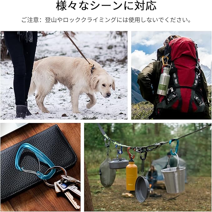 「多用途」:この8KNカラビナはハンモックキャンプ、釣り、ハイキングなどのアウトドアから旅行やブランコなどのレジャーまで幅広い場面で活躍します。犬のリードやスポーツボトル、キーホルダーなどを取り付けるのにも適しており、用途が広いです