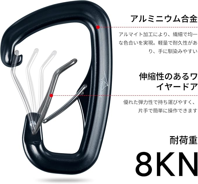 「軽量高耐荷重」:重さわずか26グラムのカラビナクリップは、8KN(800KG)の高耐荷重を誇り、アウトドア愛好家に最適です。コンパクトなデザインと滑らかな表面により、持ち運びや操作が簡単です