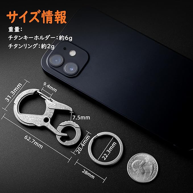 サイズとパッケージ:キーホルダーのサイズ:6.3 3cm。パッケージ内容:チタンキーホルダー1個、チタン合金キーリング1個(外径28mm)。