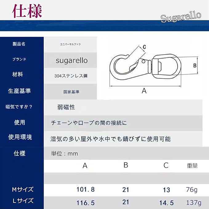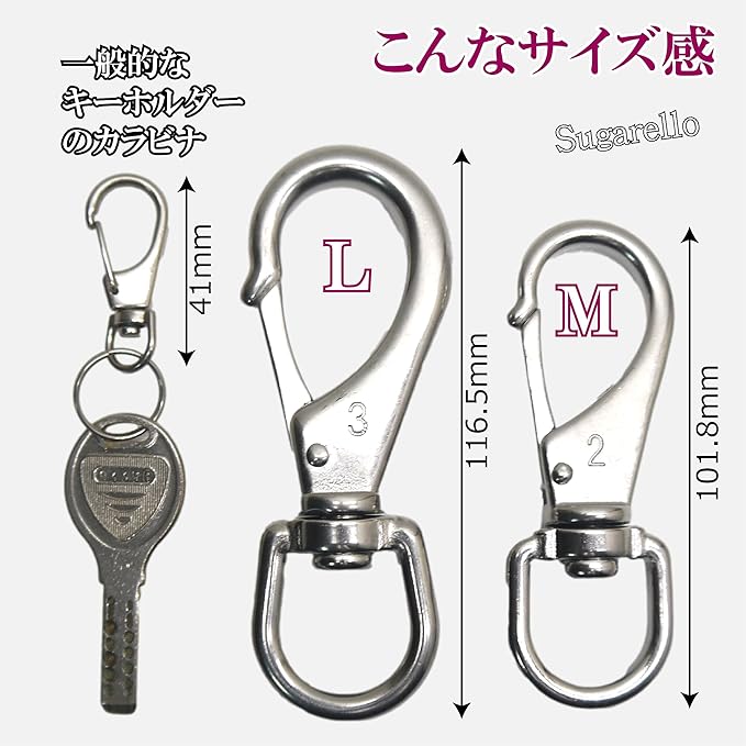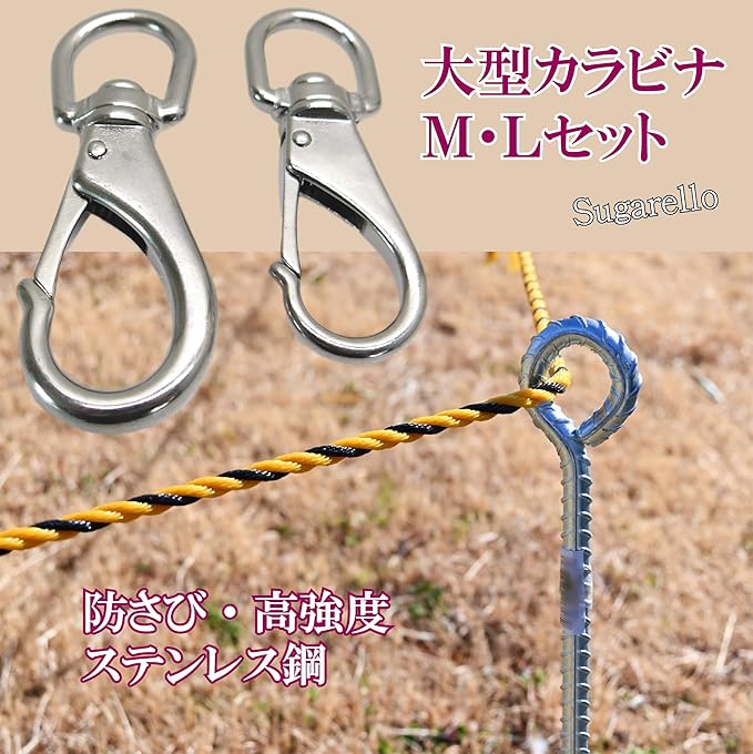 Sugarello カラビナ スナップフック 大型 万能フック ステンレス 耐久性 SUS304 頑丈 多機能 スプリングフック アウトドア キャンプ 登山 M・L、2種セット