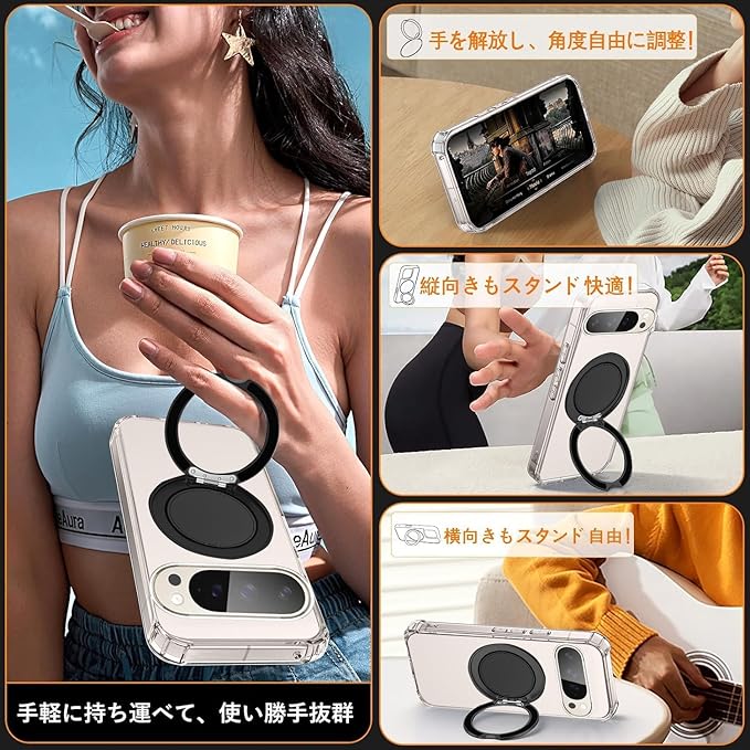 対応 Google Pixel 10 / 10 Pro ケースリング 耐衝撃 360 回転 スタンド機能 縦横両対応 米軍MIL規格 TPU ソフト 透明 シリコン 車載ホルダー対応 滑り止め 落下防止 全面保護カバー (クリア)