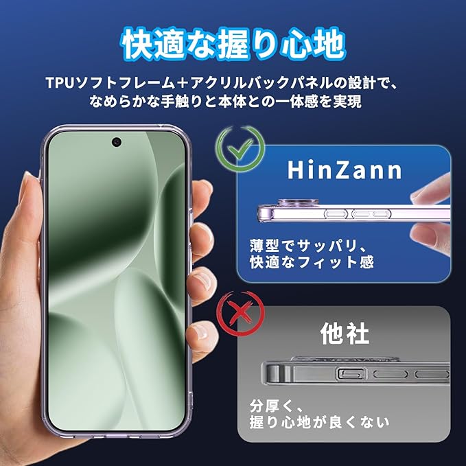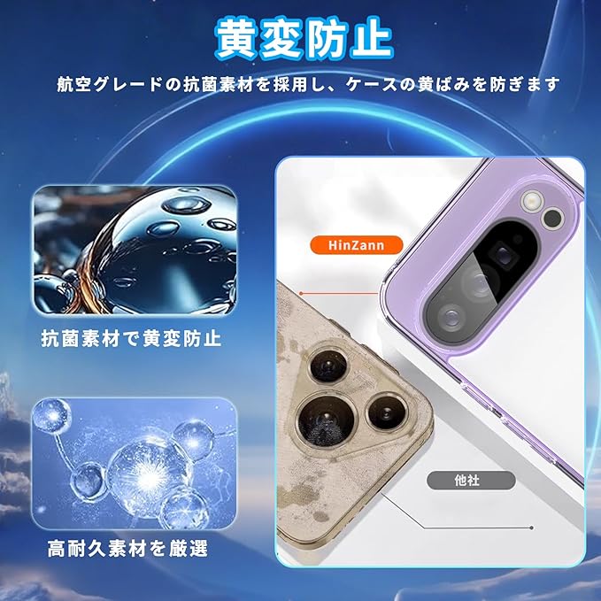 [5D全透明バックプレート]TPU透明ケースは99%の透過率を実現し、Google Pixel 10 Pro XLの美しいボディデザインを忠実に再現。航空機級の黄変防止素材を採用し、特殊コーティング処理を施しているため、紫外線・汗・経年劣化による変色や黄ばみを防止。長期間使用しても透明で美しい状態を保ちます。