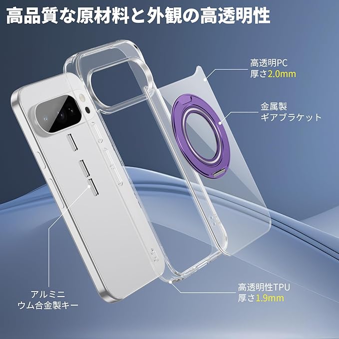【高透明度設計】Pixel 10 Proカバーは、高い透明度を誇るデザインを採用し、スマートフォン本体の色を美しく引き立て、エレガンスとスタイルを演出します。Pixel 10スマホケースの背面パネルに搭載された金属製の回転式スタンドは、グレー、シルバー、ピンク、ブルー、パープルの5色展開です。