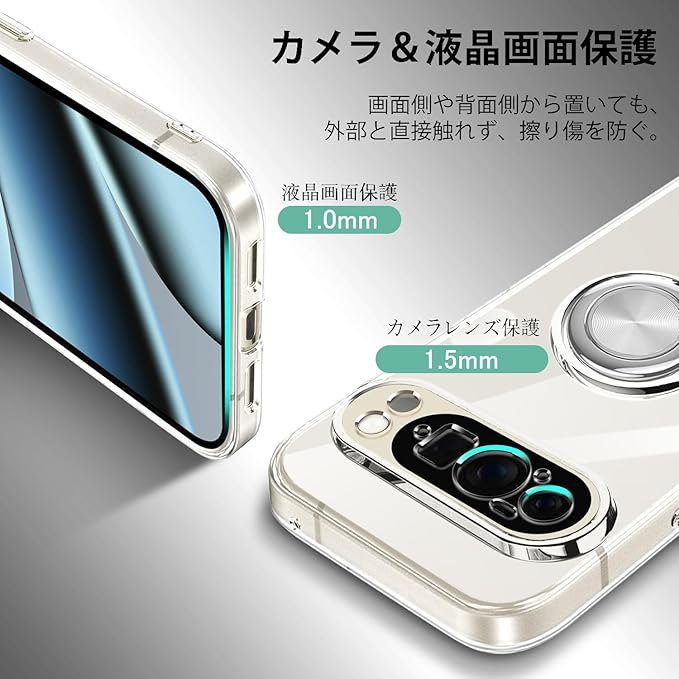 【安心保護】前面と背面カメラ部のフチを高く設計し、液晶画面とカメラレンズをキズから保護します。また、 ケースをつけたまま違和感なくボタン操作やコネクタへの接続が可能です。