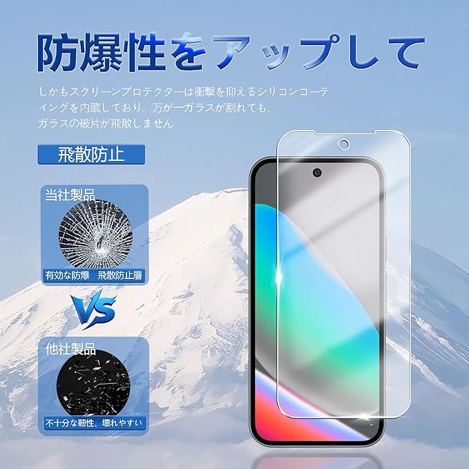 【9H硬度で最強防御】:9Hの硬度を持っている強化ガラスにより、スクリーンを保護を与え、鍵やカッターなどの鋭いものにキズと割れから守ります。125MPaの圧縮強度(通常ガラスの5倍)で落下衝撃から画面を守ります。ガラスフィルムは飛散防止加工されておりますので、万が一割れの場合でも、破片が飛び散らず張り付いた状態になります