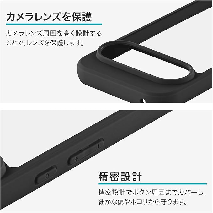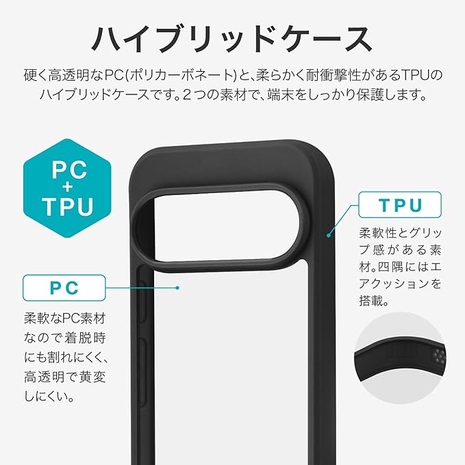 【ハイブリッドケース】硬く透明度の高いPC(ポリカーボネート)と、柔らかく耐衝撃性があるTPUのハイブリッドケースです。2つの素材で端末をしっかり保護します。【耐傷・耐衝撃】ケース背面は硬く透明度の高いPC(ポリカーボネート)です。傷に強く、黄変しにくい素材です。側面は柔軟性があるTPU素材で、四隅にはエアクッションを搭載。落下時に多い角への衝撃に備えます。【持ちやすく、使いやすい】側面のTPUはグリップ感に優れ、持ちやすく落下防止に繋がります。万が一の落下時に備え、四隅にはエアクッションを搭載。【精密設計】カメラレンズ周囲を高く設計することでレンズを保護。ボタン周囲までカバーする精密設計で、細かな傷やホコリから守ります。【もっと便利に】ケース側面下部にはストラップホールを搭載。松葉紐タイプのストラップを装着できます。更にケースを装着したままケーブル充電が可能です。※全て充電ケーブルの動作を保証するものではありません。