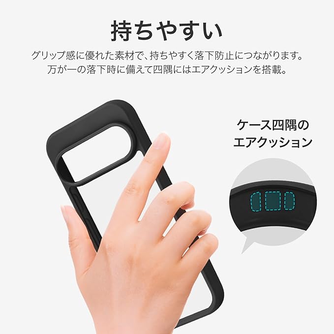 【持ちやすく、使いやすい】側面のTPUはグリップ感に優れ、持ちやすく落下防止に繋がります。万が一の落下時に備え、四隅にはエアクッションを搭載。
