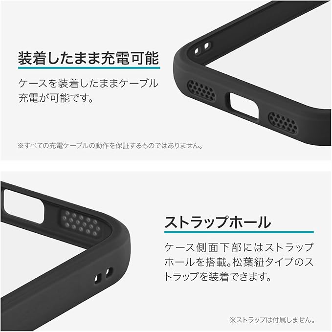 【もっと便利に】ケース側面下部にはストラップホールを搭載。松葉紐タイプのストラップを装着できます。更にケースを装着したままケーブル充電が可能です。※全て充電ケーブルの動作を保証するものではありません。
