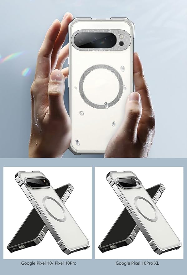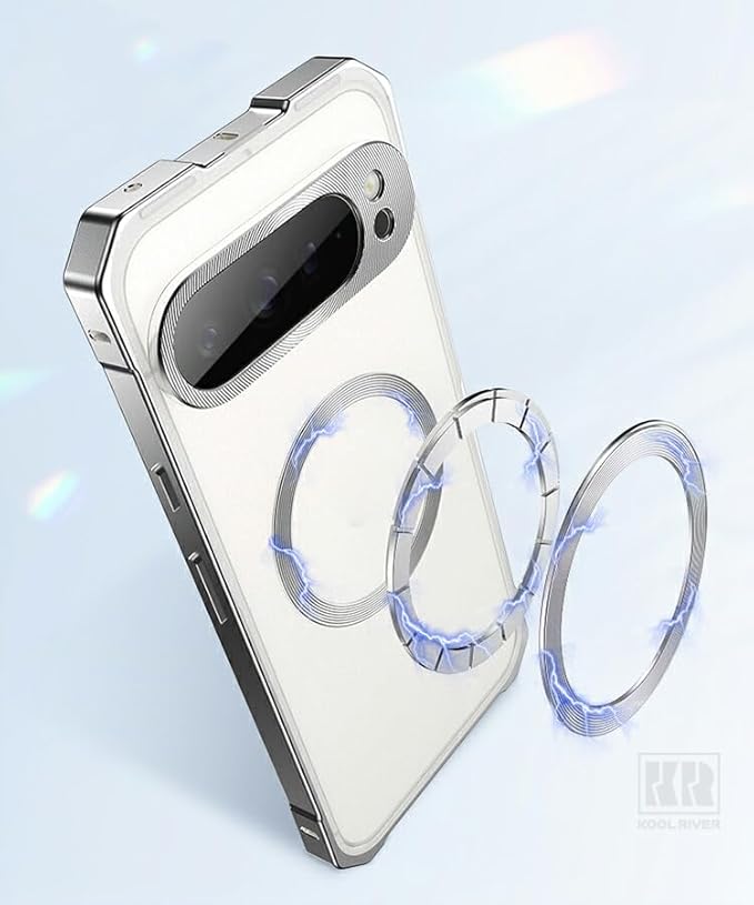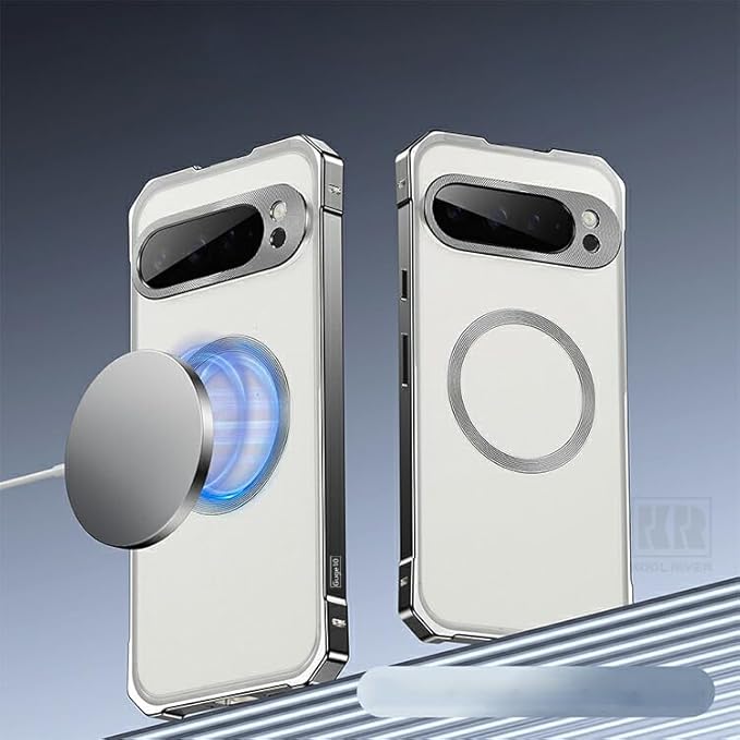 KOOLRIVER・For Pixel10 Pro バンパー ケース アルミバンパー 背面クリア アルミ マグネットで装着 背面半透明 背面パネル付き Qi充電 ワイヤレス充電 対応 かっこいい グーグル ピクセル10 プロ(シルバー)