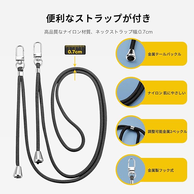 【 使いやすさ】:柔らかいナイロンストラップで首を快適に保ち、ストレッチの長さを調整でき、ストラップを取り外して、電話ケースを単独で使用できます。ストラップの全長は1.3メートルですケースにもチェーンが1本付いて、小さな穴を通ってケースとつながって固定しています。このようにあなたは快適に携帯電話を首にかけることができます!②ネックストラップ付きのスマホを首掛け・肩掛け・斜掛けしてハンズフリーできるだけでなく、外でご愛用のスマホの紛失も防止します。外出、普段使用にとても便利です。直径約7 mmで高品質なロープの端は金属製である。調節可能なロープは両手を放します,可斜めがけ、可肩掛け、ショルダーバッグは任意の長さまでロープをかけることができます。③下部に取り外し可能なストラップ取り付け金具付き、落下防止に役立ちし、使用中に邪魔しなくてとても便利です。