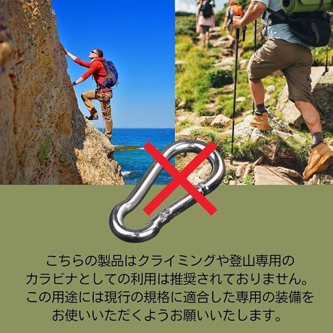 【様々な用途で】日常使いにおいては、バックパックのストラップにキーやケトルを簡単に吊るせるため、移動中にも手軽にアクセスできます。さらに、犬や猫のリードフックとして使用することも可能で、ペットと一緒に公園で遊ぶ時にも大変便利です。このツールは、家庭やオフィスでのキーチェーンとして日常的に利用するのにも適しています。注意点として、こちらの製品はクライミングや登山専用のカラビナとしての利用は推奨されておりません。この用途には現行の規格に適合した専用の装備をお使いいただくようお願いいたします。