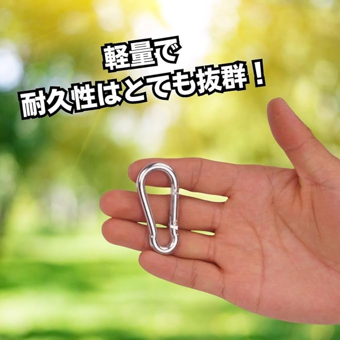 【手軽に使える】操作が簡単なワンタッチ取り付けで、日常生活やアウトドア活動において幅広く利用できる便利なツールです。この製品は、キー、ケトル、バックパック、ロープなど様々なアイテムを手軽に接続するのに最適です。例えば、キャンプ場で重いバックパックをしっかりと固定したり、釣り用具をまとめて持ち運ぶのが非常に便利です。また、遮光ネットや腰道具、ブランコの取り付けにも適しています。