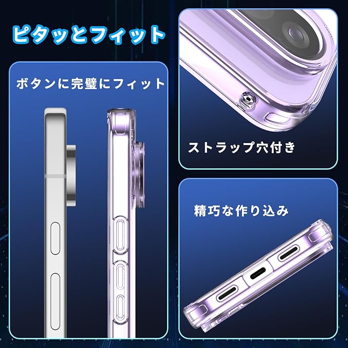 [巧妙なデザイン]柔軟性のあるTPUフレームとアクリルバックプレートを採用し、日常の取り付け・取り外し時にスマホを傷つけず、指紋も付きにくく、快適な手触りを実現。ケースは高さ調整が施され、ディスプレイより0.8mm、カメラより0.5mm高く設計。四隅には強化エアバッグを搭載し、衝撃を効果的に吸収。1.5メートルの落下テストをクリアし、全面的なスクラッチ防止と耐衝撃性を提供。さらに、ストラップホールを装備し、お好みのストラップを取り付け可能。