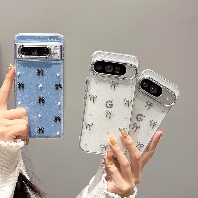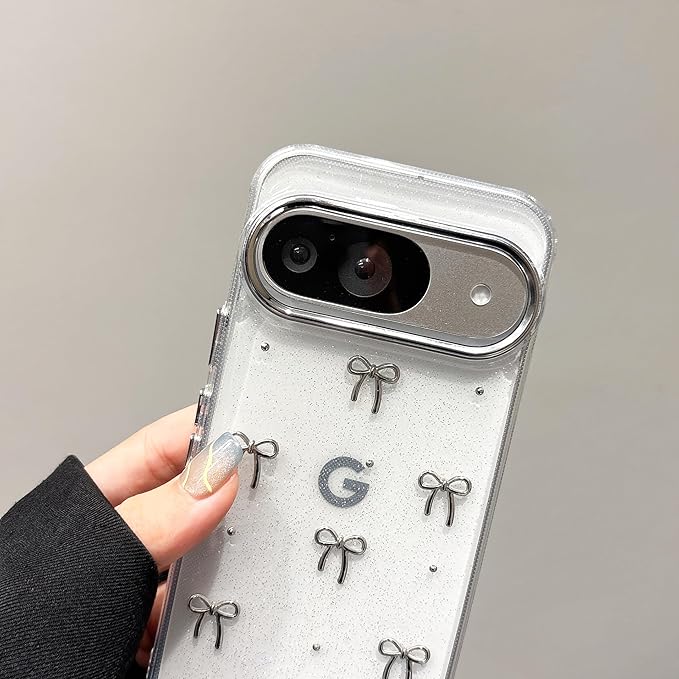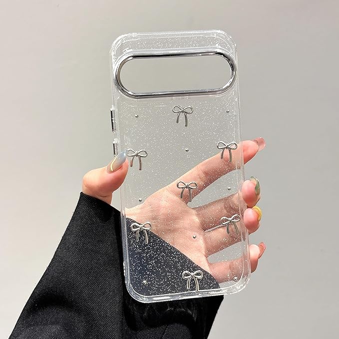 QLTYPRI Google Pixel 10/10 Pro/9/9 Pro 用 ケース クリア シルバー ミニリボン おしゃれ 韓国 透明 可愛い 耐衝撃 スマホケース 立体 りぼん装飾 きらきら ピクセル 10/10 Pro ケース 対応、シルバー