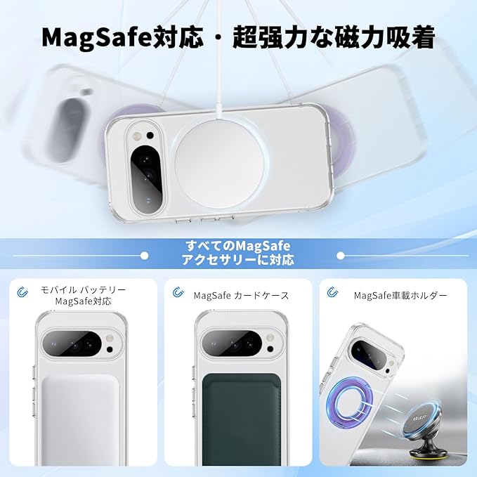 【MagSafe対応】Pixel 10 Proケースは背面に強力なマグネットを搭載し、高速ワイヤレス充電が可能です。また、モバイル電源やカーマウントなど、様々なMagSafeアクセサリーに安定して吸着することができ、よりリラックスした使用体験をもたらします。