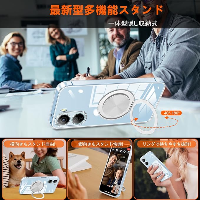 【多機能360度!縦も横も思いのまま!】Google Pixel 10/Pixel 10 PRO 用ケースは、革新的な隠し式スタンドデザインを採用しています。360 回転スタンド機能により、縦置き・横置きどちらの状態でも安定して利用でき、0 ~ 150 の間で多角度自由に調整できます。。動画視聴、オンライン授業、リモート会議、ビデオ通話などで大活躍、あらゆる視聴の瞬間をお楽しみください。スタンド台を持ち運ぶ必要がなくなり、外出時にも便利です。手に取るだけでリングとしても使えるので、機能性にも優れています。