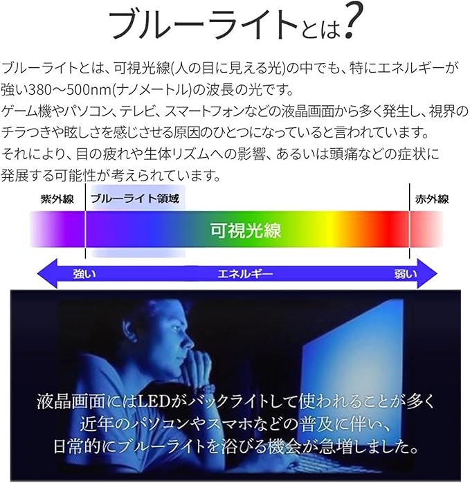 【最新ブルーライトカット機能 目の疲れ軽減】:携帯電話やパソコンの画面を長時間見ている人は、画面が多くのブルーライトと紫光を生成し、時間が経つと目の疲れ、目の近視、睡眠障害などの原因になります。先進ブルーライトカット反射技術により、ブルーライトと紫光を大幅にカットでき、目への負担が軽減されます。ブルーライトから目を守りディスプレイを、長時間眺める方に効果を発揮します