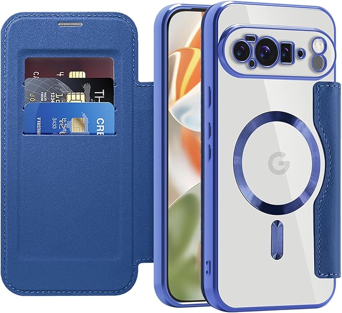 Casesmo Google Pixel 10 Pro XL用 ケース 手帳型 Magsafe対応 背面 透明 かわいい グーグル ピクセル10 Pro XLスマホケース カード収納 財布付き 耐衝撃 薄型 軽量 TPU+PUレザー 全面保護 耐摩擦 ストラップホール付きカバー,ブルー