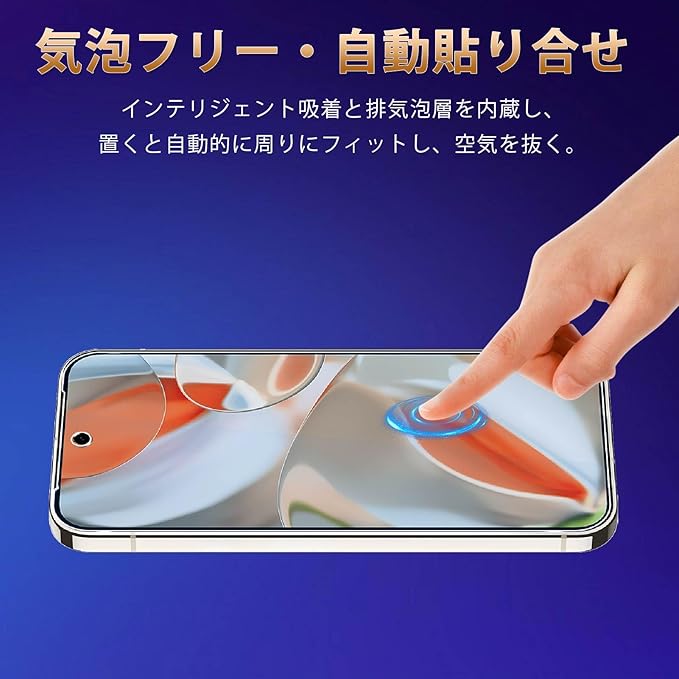 【簡単で貼りやすい】保護フィルムの接着面は特別な自動吸着層を採用しており、ガラスフィルムを携帯電話の画面に合わせるだけで自然に吸着し、気泡が発生しにくいです。保護フィルムを貼ることが苦手な方にとっても、簡単に操作できます。