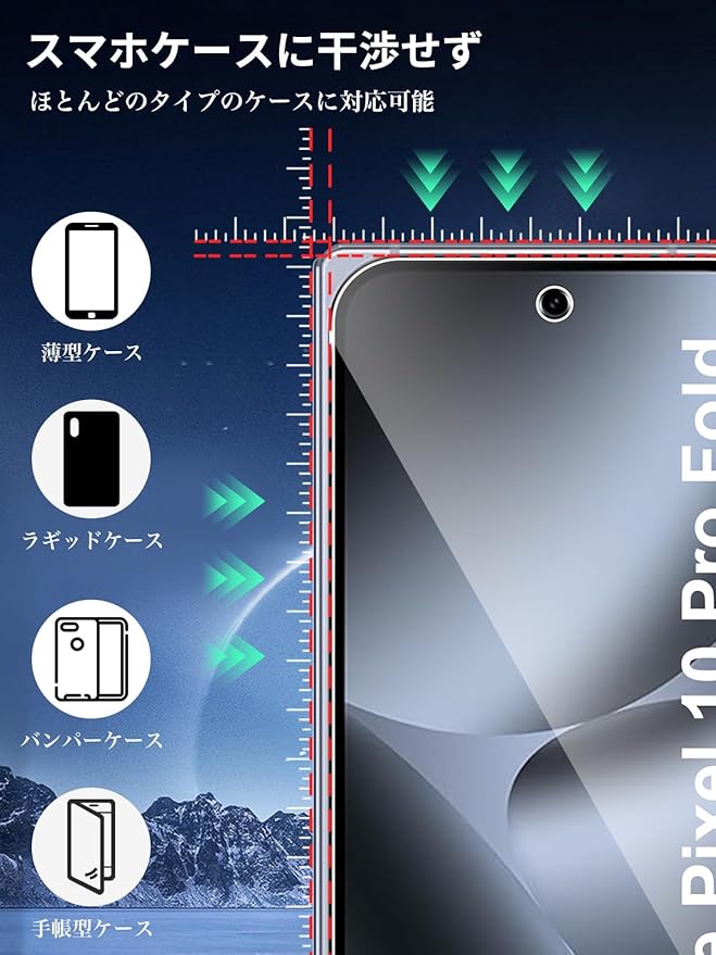 【適用機種】Google Pixel 10 Pro Fold 対応の保護フィルム(2枚)と背面フィルム(2枚)とレンズフィルム(2枚)です。スマホの液晶画面やカメラレンズどちらも保護できます。