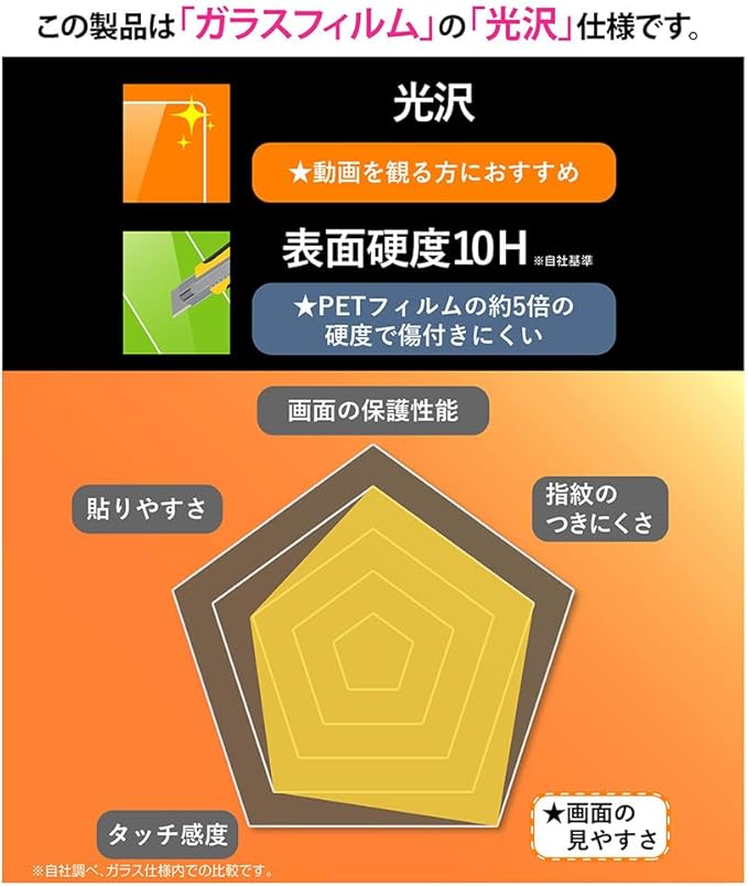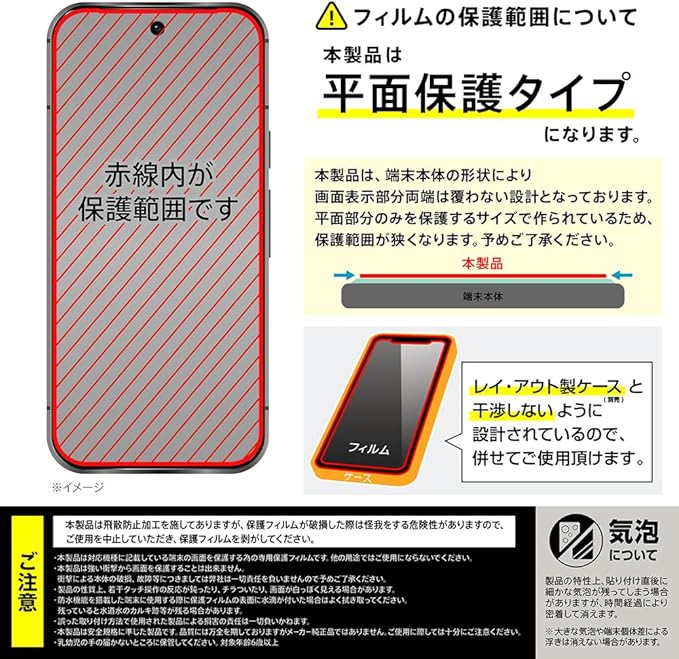 PETフィルムの約5倍の硬度で傷付きにくい。美しい光沢仕様で、高画質な写真や動画が綺麗に見える。防汚コーティングで指紋防止効果。レイ・アウト製ケース(別売)と一緒に使用しても干渉しない設計。