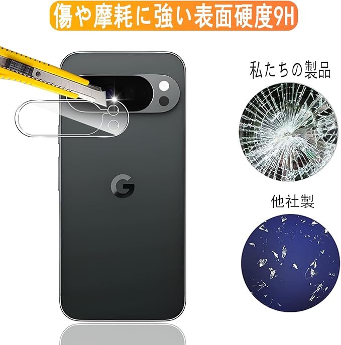 【9H強度&飛散防止】対応 Pixel 10 Pro XL レンズ 強化ガラス 保護フィルムは日本旭硝子素材を採用します。 落下、スクラッチ、衝突、衝撃に高い耐久性があります 衝撃を最小限に抑えてカメラの破損を抑え。カッターなどの鋭利なものを当たってもキズが付きにくくて高い強度を持ち表面硬度9Hが特徴です。特殊な飛散防止設計により、万一割れてしまった際にも飛散することなく、高い安全性を実現します。