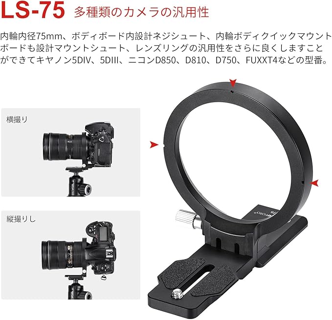 多種類のカメラの汎用性:内輪内径75mm、ボディボード内設計ネジシュート、内輪ボディクイックマウントボードも設計マウントシュート、レンズリングの汎用性をさらに良くしますことができてキヤノン5DIV、5DIII、ニコンD850、D810、D750、FUXXT4などの型番。