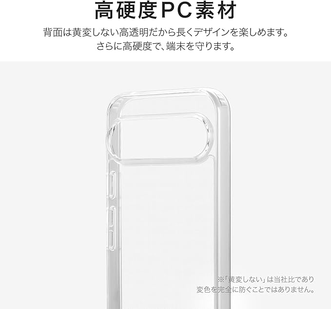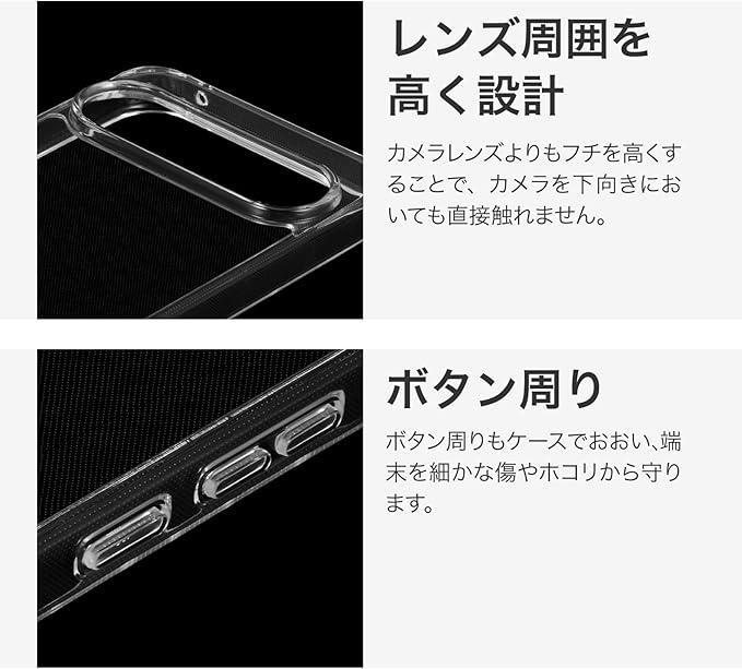 【耐衝撃】 硬く高透明なポリカーボネートと、柔らかく耐衝撃性に優れたTPUのハイブリッドケース/角に衝撃を吸収するエアクッションを搭載/柔軟性があり着脱が簡単/スピーカー・ボタン周囲を保護する精密設計/マイクロドット加工で端末に張り付きにくい