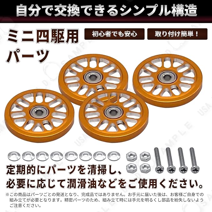 【注意事項】 ※この商品はミニ四駆用のパーツです。ミニ四駆本体は含まれません。 ※取扱説明書は付属しておりません。 ※輸入品のため多少の傷やバリ、色はげなどがある場合がございますのでご了承ください。 ※アルミ製の精密部品を含むため、取扱いには十分ご注意ください。 ※走行前には必ず各パーツの取り付けが正しく行われているかをご確認いただき、緩みやズレがないかチェックしてください。 ※小さな部品を含みますので、小さなお子様の手の届かない場所で保管・作業をお願いします。