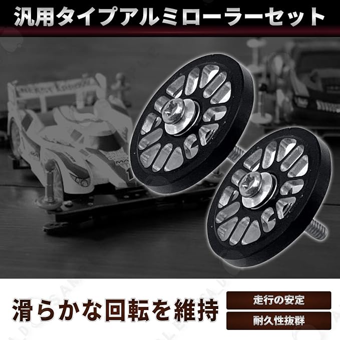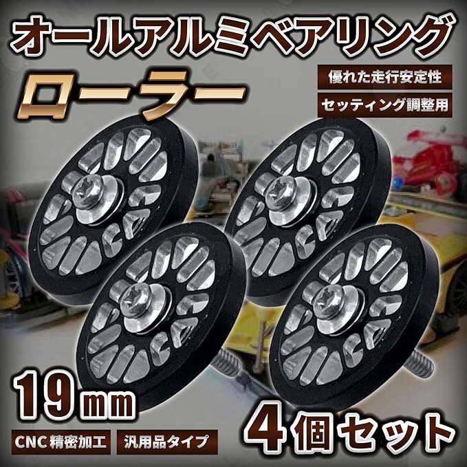 【 商品の概要と特長】 CNC精密加工によるアルミローラーセット(汎用品/19mm) この商品は、CNC加工された汎用タイプのアルミローラーセットです。ローラーサイズは直径19mmで、ミニ四駆のカスタム用ローラーパーツです。アルミ素材を使用しており、軽量化、耐久性、走行安定性に優れています。練習走行やセッティングの調整用として幅広く活用できます。