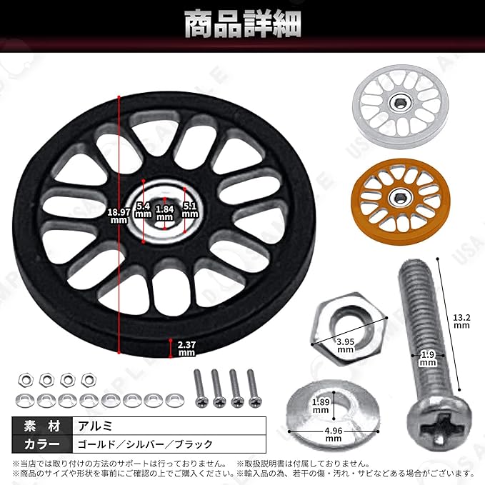 【カラーバリエーション】 ゴールド/シルバー/ブラック 【セット内容】 アルミローラー4枚 取り付け用のネジ、ビス、ナット、ワッシャー(画像参照) 素材:アルミニウム合金 サイズ:メインパーツ19mm、他画像参照
