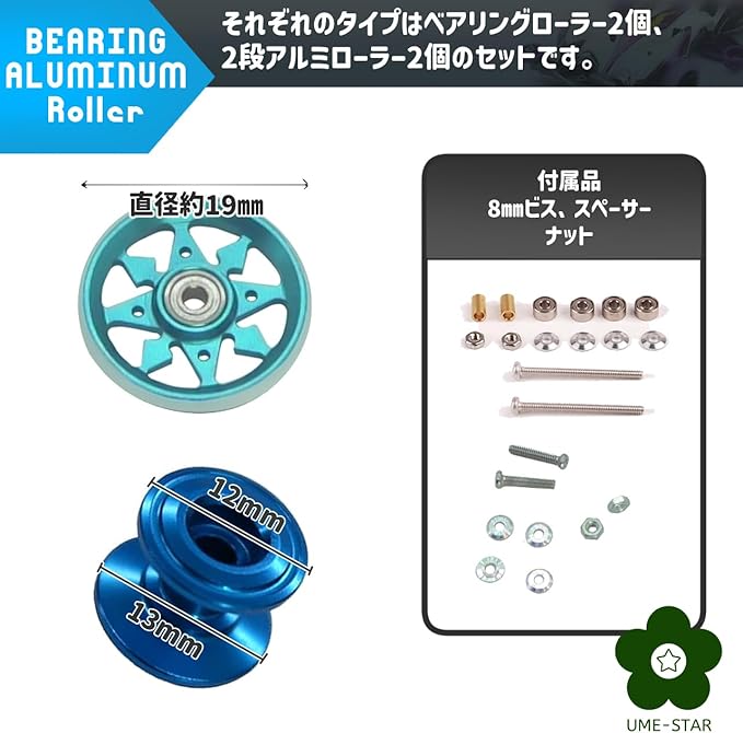 車体のカラーリングに合わせて、赤白タイプ、青白タイプ、黒白タイプの3種類からお選びいただけます。 それぞれのタイプはベアリングローラー2個、2段アルミローラー2個のセットです。8㎜ビス、スペーサー、ナットが付属しております。