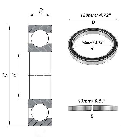 仕様:外径: 120mm/ 4.72インチ、内径: 95mm/ 3.74インチ、幅: 13 mm/ 0.51インチ、タイプ: 6819DD、精度レベル: P6、基本荷重評価 (kN): Cr:19.3 C0r:22、限界速度(min-1): グリスス:2800
