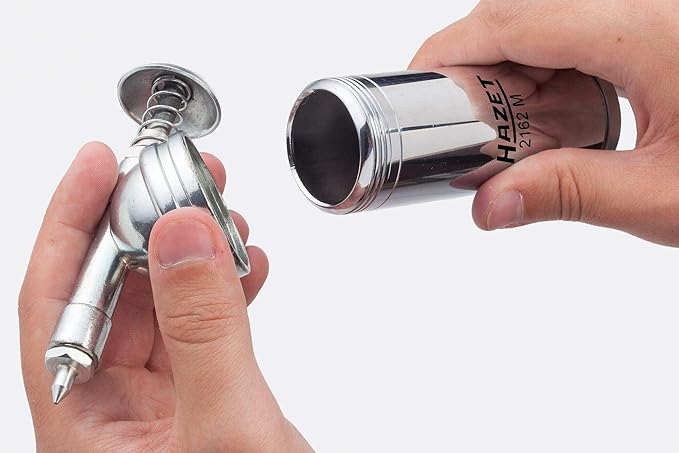 HAZET ミニグリースガン; 商品番号: 2162M; EAN: 4000896185634; 用途: 打撃機構、スピンドルなどの精密な潤滑; 充填容量: 80 g; 最大1,000 PSI / 69 barの圧力を発生; 緩いグリースで充填; 50 と90 デザインのグリースニップルを含む; 寸法/長さ: 145 mm; 正味重量(kg): 0.27 kg