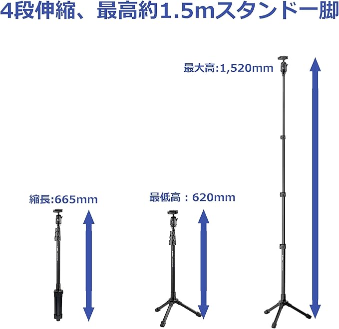 ■全高:1520mm、■最低高:620mm、■縮長:665mm、■脚径/段数:ポール20mm4段/脚部17mm1段■質量:485g、■推奨積載質量:1.0kg、■雲台分離:不可