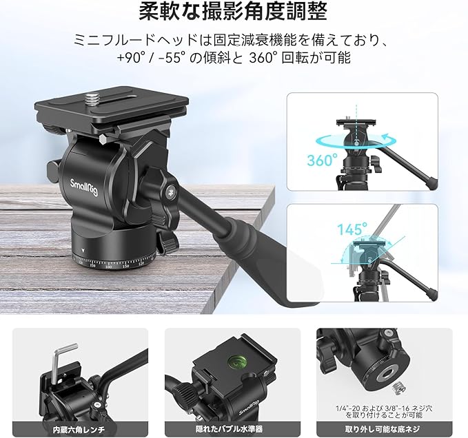 【ミニフルードヘッド付き】コンパクトでポータブルなミニフルードヘッドは固定減衰機能を備えており、スムーズな操作を保証します。 +90 /-55 の傾斜と360 回転が可能で、取り外し可能な滑り止めレバーとアルカタイプのクイックリリースプレートが付属しており、手持ち撮影と三脚撮影を素早く切り替えることができます。 内蔵スパナにより、カメラのセットアップが簡単になります(フルードヘッド - 油圧チャンバーとダンピンググリースを備え、固定反発力と固定減衰を提供します)。