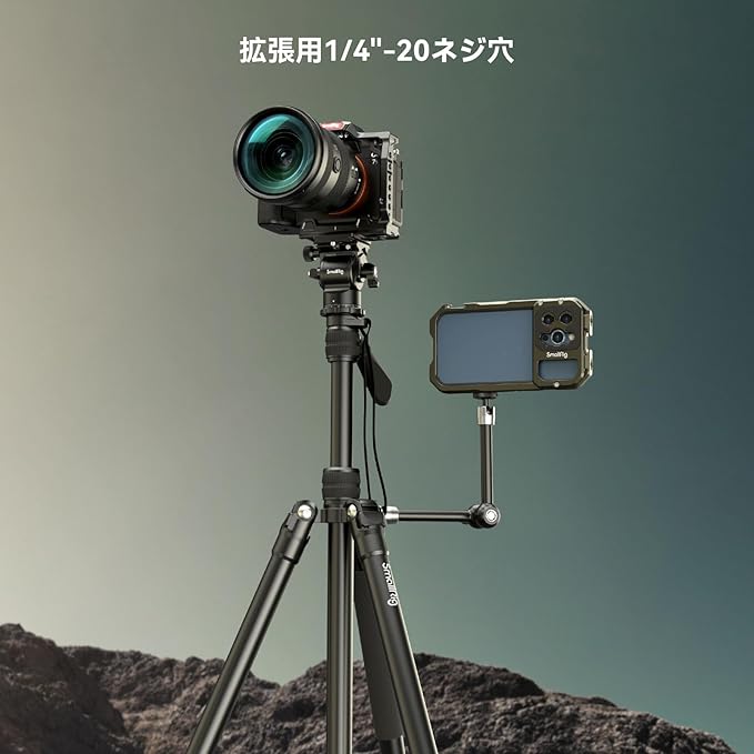 【革新的なデザイン】他の三脚とは異なり、この三脚にはブラケットに1/4インチのネジ穴が追加されており、外部マジックアーム、携帯電話、モニターなどのニーズを満たすことができます。また、SmallRigは三脚のノブを改良しました。 他のブランドの三脚とは異なり、SmallRig はプラスチック製のノブの破損を避けるために三脚の脚を固定するために金属製のノブロックを使用しています。