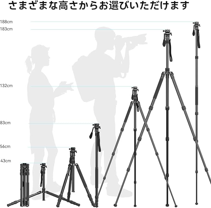 【調整可能な三脚】ノブロック付きの4セクションコラムレッグにより、作業高さを16.5インチから72インチまで数秒で調整できます。 16.5インチの折りたたみサイズは、屋外の写真撮影のためにどこにでも簡単に持ち運べ、時間を節約し、撮影を楽しむことに集中できます。最大15kg(三脚)、3kg(フルード雲台)までのデバイスをサポートできます。