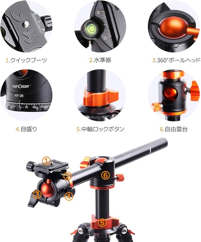 【低重心自由雲台&クイックシュー】俯瞰三脚は28mm金属製、耐荷重10kg持つの自由雲台を装備しています。操作簡単の上スペースを節約できます。雲台にはアルカスイス互換クイックシューと水準器と目盛りが装備しています、水平確認などに使い易いです。1/4インチネジに適応な一眼レフやミラーレスカメラやスマホスタンドなどに対応します。