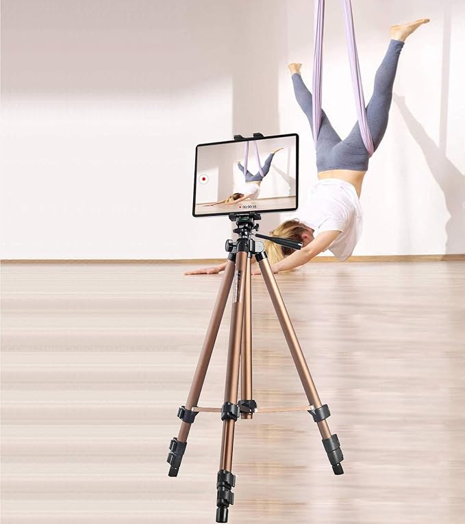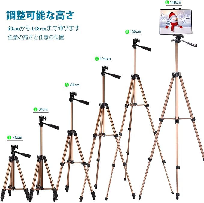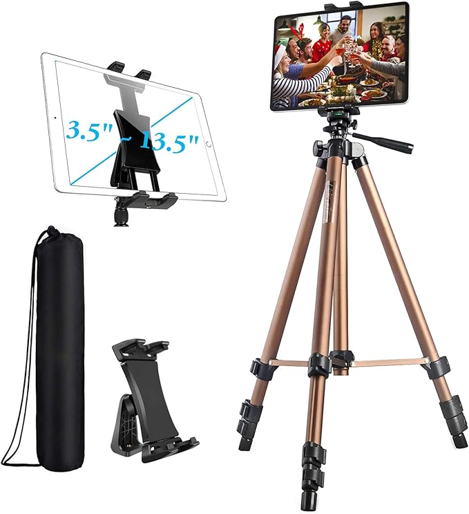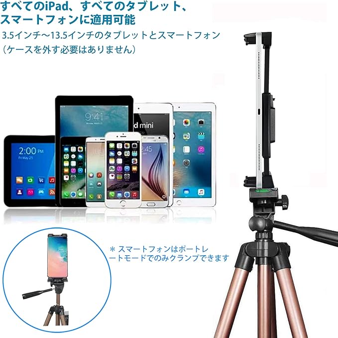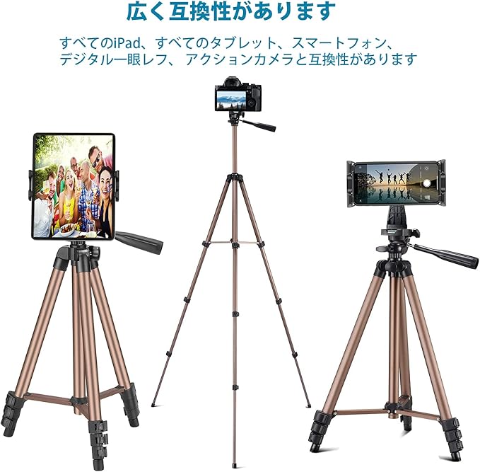 iPad三脚スタンド 51インチ 高さ調節可能 アルミニウムマウントホルダー iPad Pro 12.9 11 10.5 Air Mini Surface Nexus Galaxy Tab 3.5~13.5インチ携帯電話タブレット用 シャンパン色
