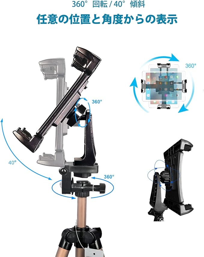 【軽量&ポータブル】: iPad三脚マウントは高品質のアルミニウム製、シャンパン仕上げ加工。 重量はわずか535gで、講義、教室でのプレゼンテーション、トーナメント、旅行、vlogging、自撮り、ポートレートや風景撮影、Facebook Youtube Twitchライブストリーミング、Facetimeなどに適しています。