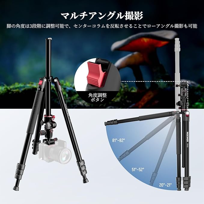 【高さ調節可能&逆折り脚】トラベル三脚を使えば、撮影環境を手軽にカスタマイズできます。3段階の脚角度調節機能を備え、高さは64cm-165cmまで調整可能です。センターコラムを上下させることで、最大230cmまでの高さまで調整できます。三脚の脚は逆方向に折りたたむと53cmとコンパクトになり、バックパックに簡単に取り付けられ、アウトドア撮影にも最適です。滑り止めゴム足が様々な地面で安定性を向上します。