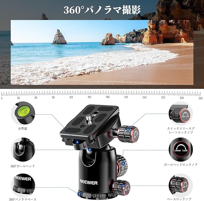 【360 ボールヘッド&アルカ型QRプレート】 360 スケール付きパンベースでカメラを回転させ、+90 から-90 までチルトさせます。ロックノブで精密な調整が可能です。三脚スタンドの1/4"アルカスイス型クイックリリースプレートは、ミラーレスカメラ、ビデオカメラ、プロジェクター、望遠鏡、スライダーなどに対応しており、同一の支持システムでデバイス間の移動を容易にします。ハンドルと水準器も付属しており、写真撮影やビデオ撮影のアクセサリーとして簡単に使用できます。